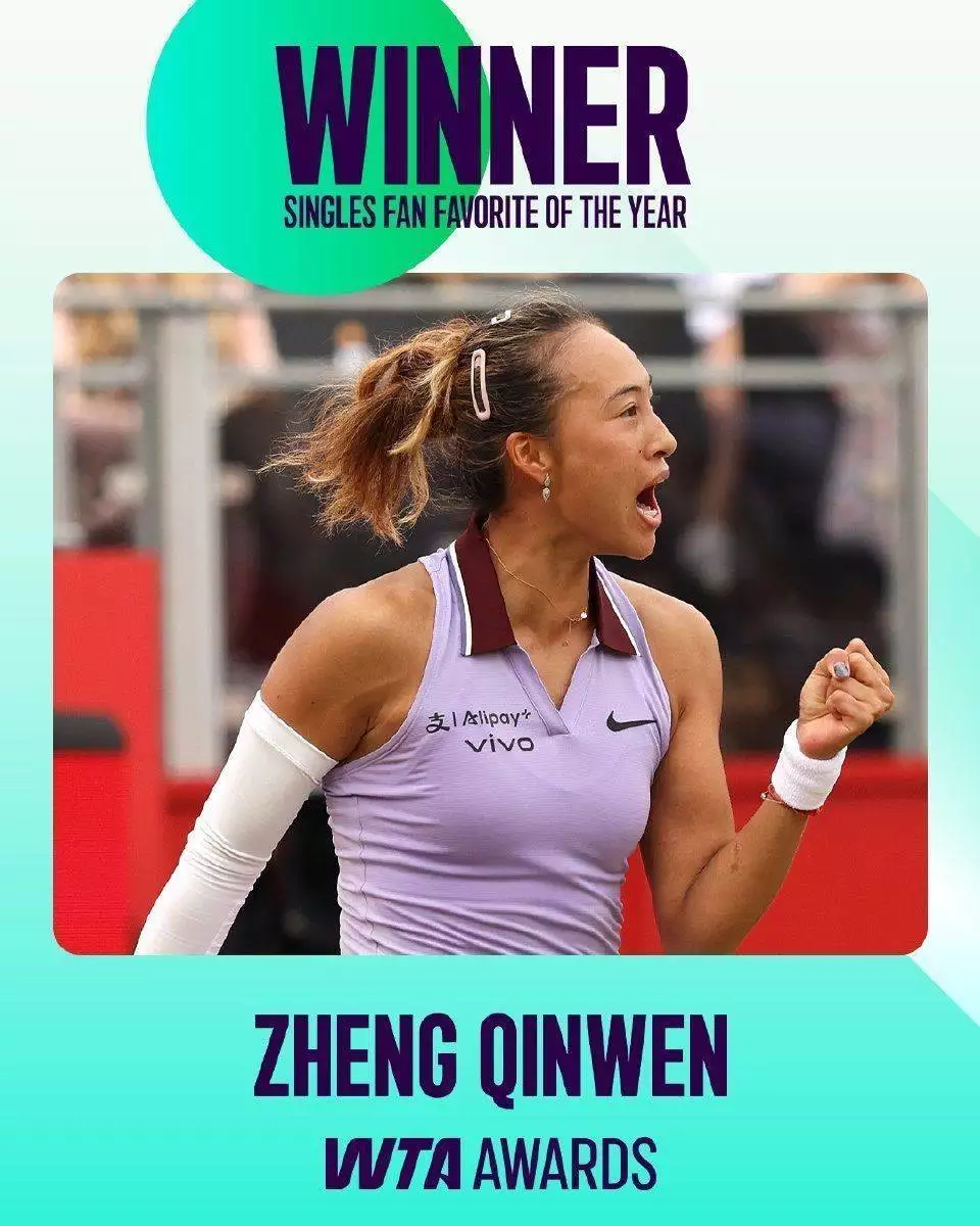 原标题:郑钦文当选WTA2025年度最受球迷欢迎单打球员